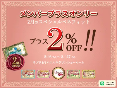 News & Event メンバープラスオンリー 2月のスペシャルベネフィット プラス2%OFF!! 2026年 2/6~2/27 New!! Dwarf IrisMariana Limited Collection 2026年 2/1~発売開始 2月! 2倍スタンプキャンペーン! 2026年 2/1~2/28 Raise A Glass NEWS一覧